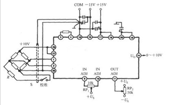 一種典型的壓力變送器與1B31的接口電路如下圖所示。1B31輸出穩(wěn)定的+10V激勵(lì)電壓,壓力變送器滿量程輸出電壓為30mV。 設(shè)定1B31的增益為333.3倍,能使0~10000磅/英寸2的壓力轉(zhuǎn)換成0~10V的輸出。為消除接地環(huán)流,信號(hào)返回端及屏蔽電纜必須在同一點(diǎn)接地。S為校準(zhǔn)開關(guān),R為支路校準(zhǔn)電阻,可對(duì)滿度輸出80%的點(diǎn)進(jìn)行校準(zhǔn)。