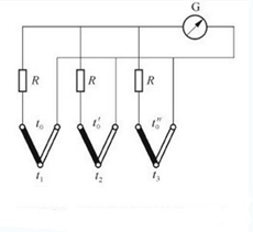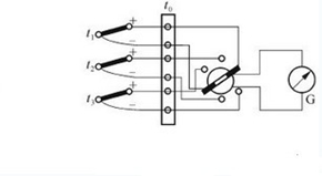圖二是多個被測溫度用多個型號相同的熱電偶分別測量,多個熱電偶共用一臺顯示儀表,它們是通過多路轉(zhuǎn)換開關(guān)來進(jìn)行測溫點切換的。多點測溫電路用于自動巡回檢測中,按要求顯示各測點的溫度值,只需要一套顯示儀表和補(bǔ)償熱電偶。