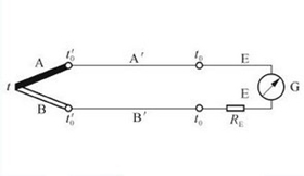 圖一是熱電偶測量溫度的基本電路,圖中A′、B′為熱電偶補(bǔ)償導(dǎo)線,t0為使用補(bǔ)償導(dǎo)線后熱電偶的冷端溫度,實際使用時把補(bǔ)償導(dǎo)線一直延伸到測量儀表的接線端子,冷端溫度即為儀表接線端子所處的環(huán)境溫度。