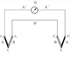 圖三是測量兩點之間溫度差的測溫電路,用兩個相同型號熱電偶反向串聯(lián),配以相同的補(bǔ)償導(dǎo)線,這種連接方法使得儀表測量的是兩個熱電偶產(chǎn)生的熱電動勢之差,因此可以測量t1和t2之間的溫度差。