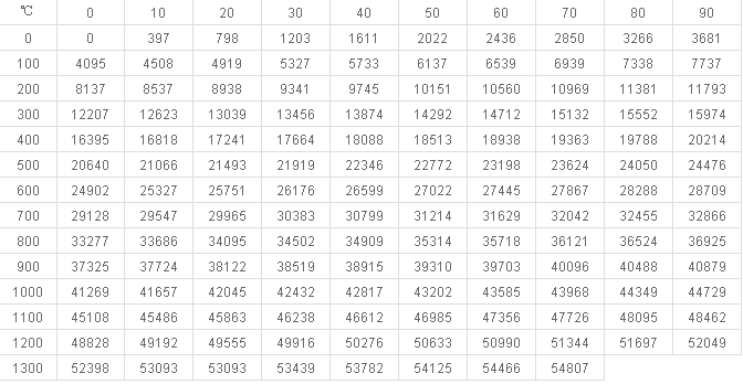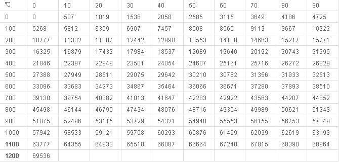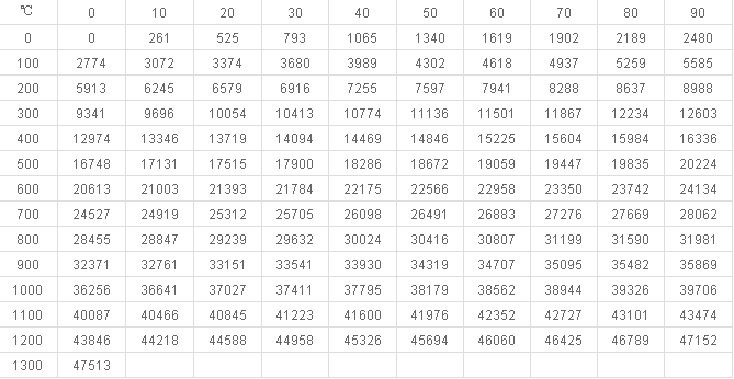 K型熱電偶分度表 K 參考端溫度:0℃ 整10度μν值