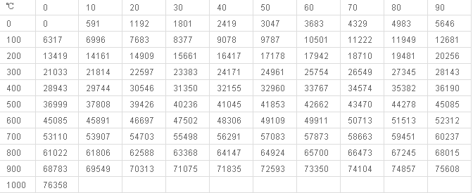 N型熱電偶分度表 N 參考端溫度:0℃ 整10度μν值